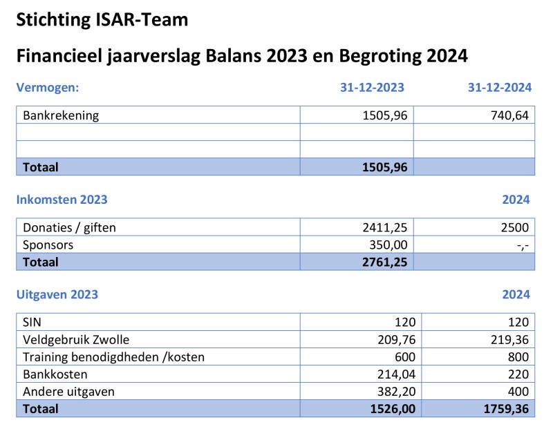 Stichting ISAR Team bestaat geheel uit vrijwilligers en heeft geen winstoogmerk. Er worden geen beloningen verstrekt aan bestuursleden en de trainer die een activiteit uitvoert voor-, of in naam van de Stichting. En er is geen personeel in dienst. Alle trainingen, examens en inzetten worden op vrijwillige basis en voor eigen kosten gedaan. Elk lid schenkt jaarlijks een donatie ter hoogte van een bedrag dat door het bestuur is vastgesteld. Daar waar sponsoren middelen / donaties en giften zal via een staat van baten en lasten het financieel jaarverslag aangetoond worden dat dit geïnvesteerd wordt in de benodigde materialen en apparatuur voor de training en opleiding van de teams.